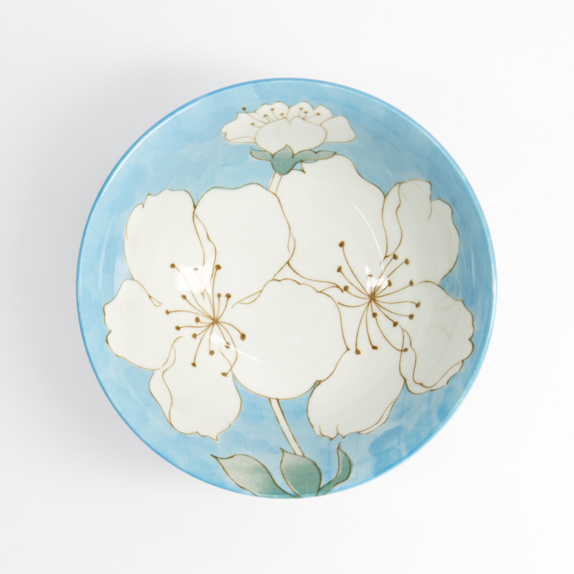 Porcelain bowl with cherry blossom design in blue. Dishwasher and microwave save. Made in Japan.