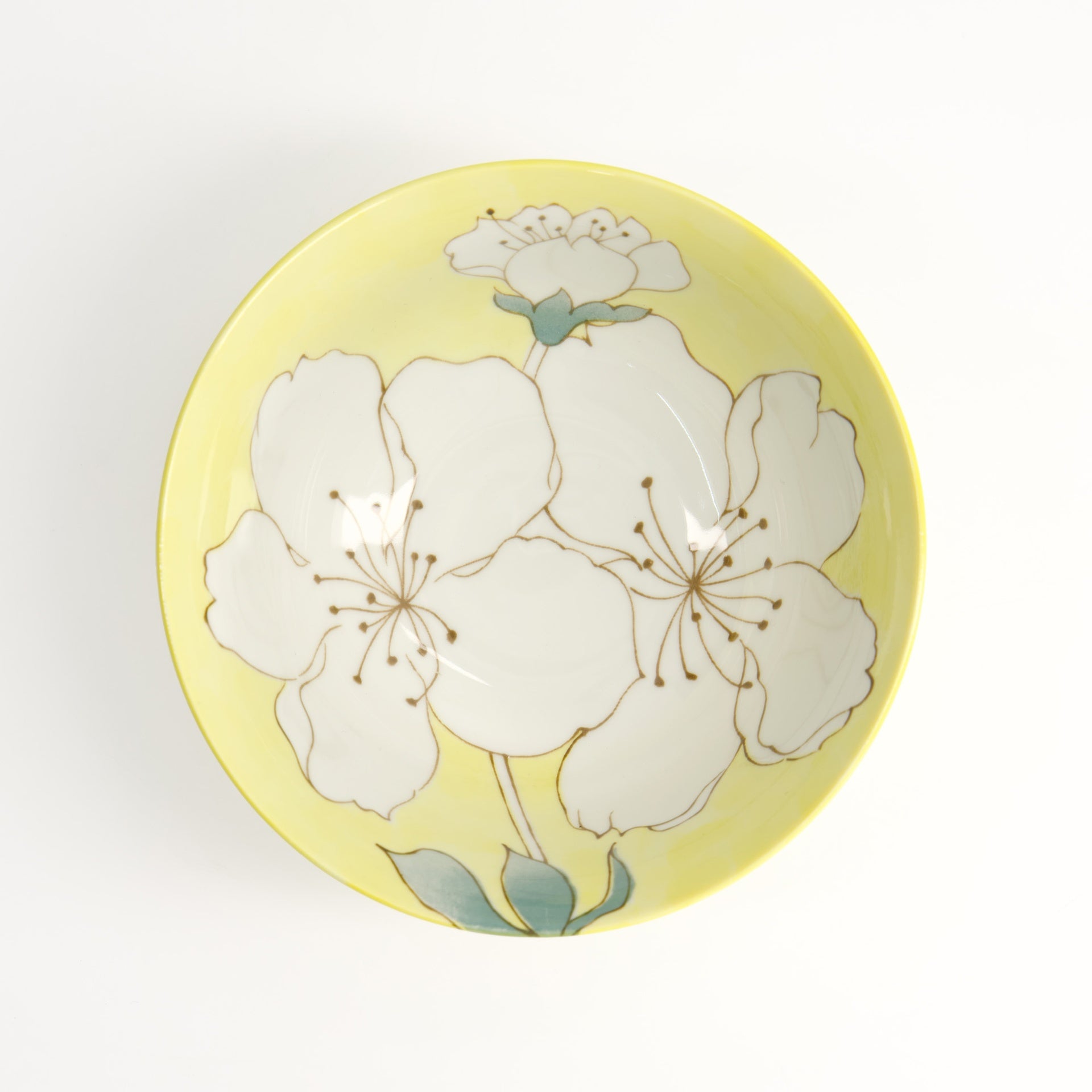 Porcelain bowl with cherry blossom design in yellow. Dishwasher and microwave save. Made in Japan.