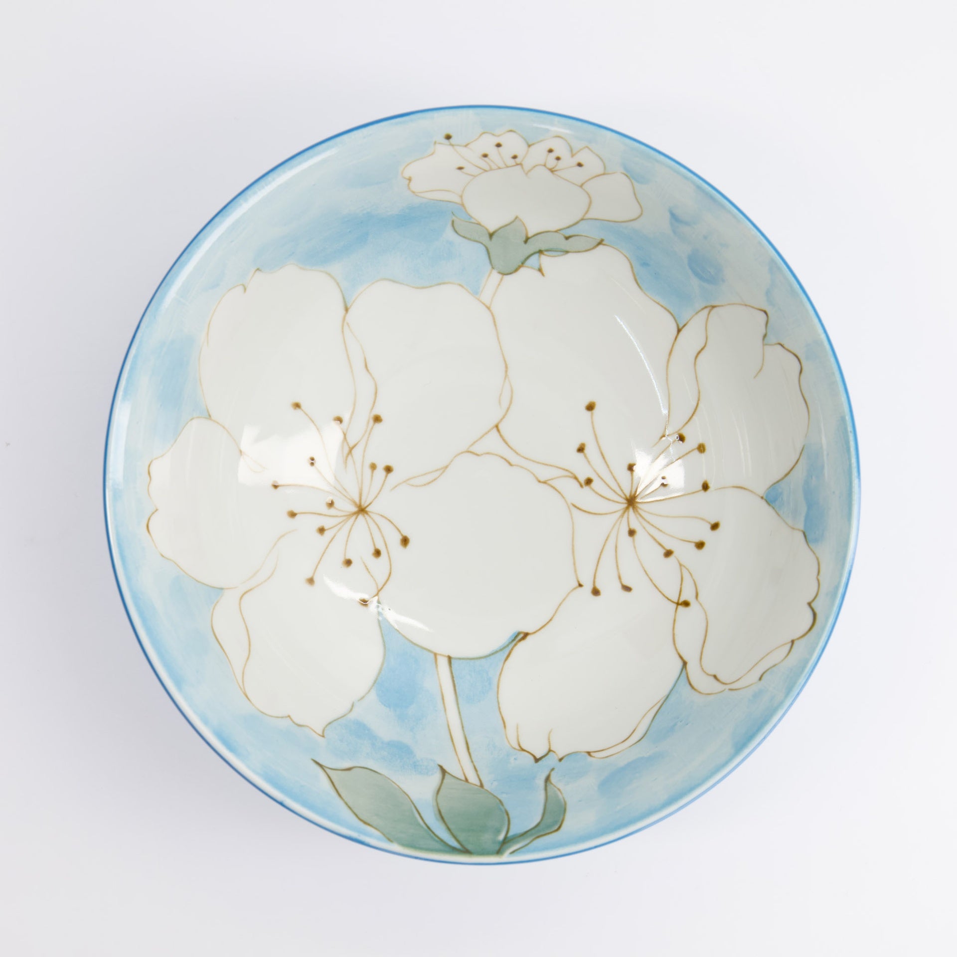 Porcelain ramen bowl with cherry blossom design in blue. Dishwasher and microwave save. Made in Japan.